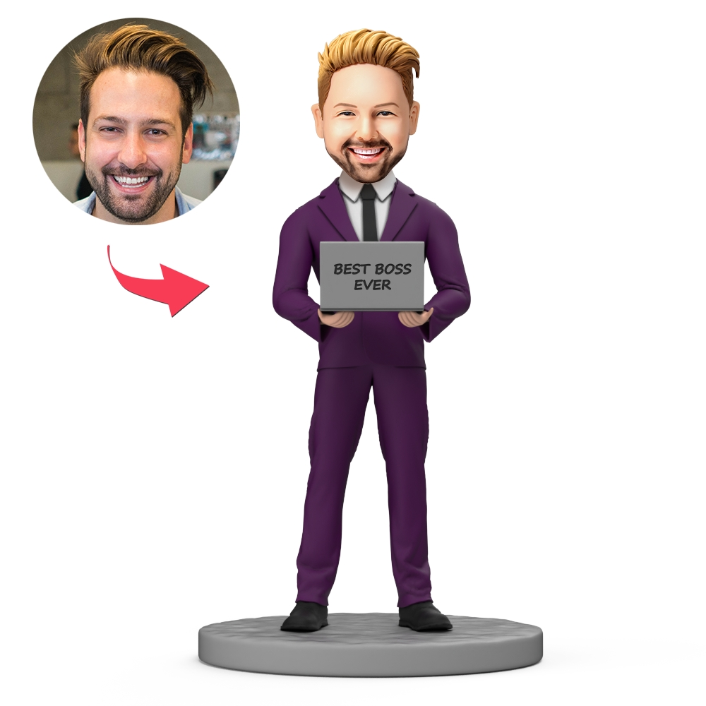Male Boss Wear Purple Suit Work with Computer in Hand Custom Bobblehead with Engraved Text