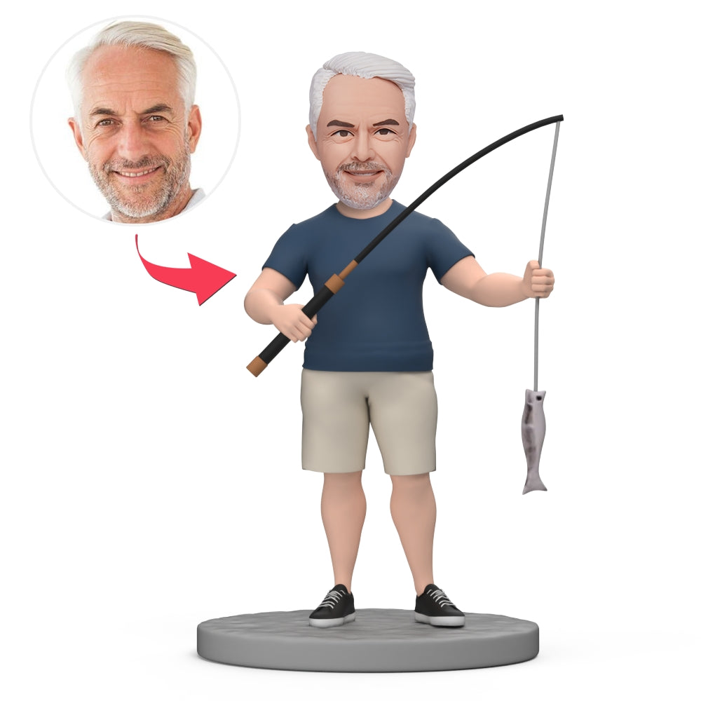Grandfather Hold Fishing Rod Custom Bobblehead with Engraved Text