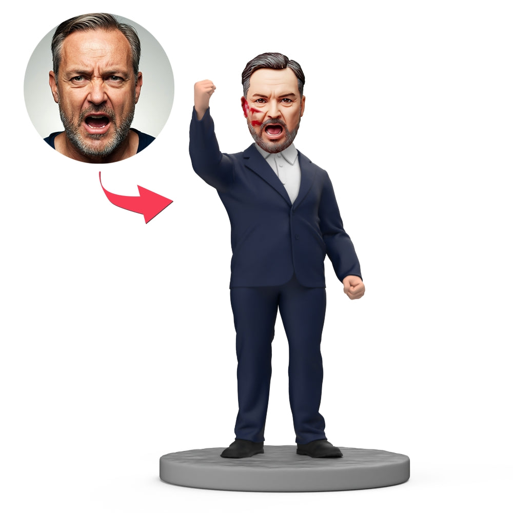 Hero Raises Fist Wear Navy Blue Suit Custom Bobblehead with Engraved Text