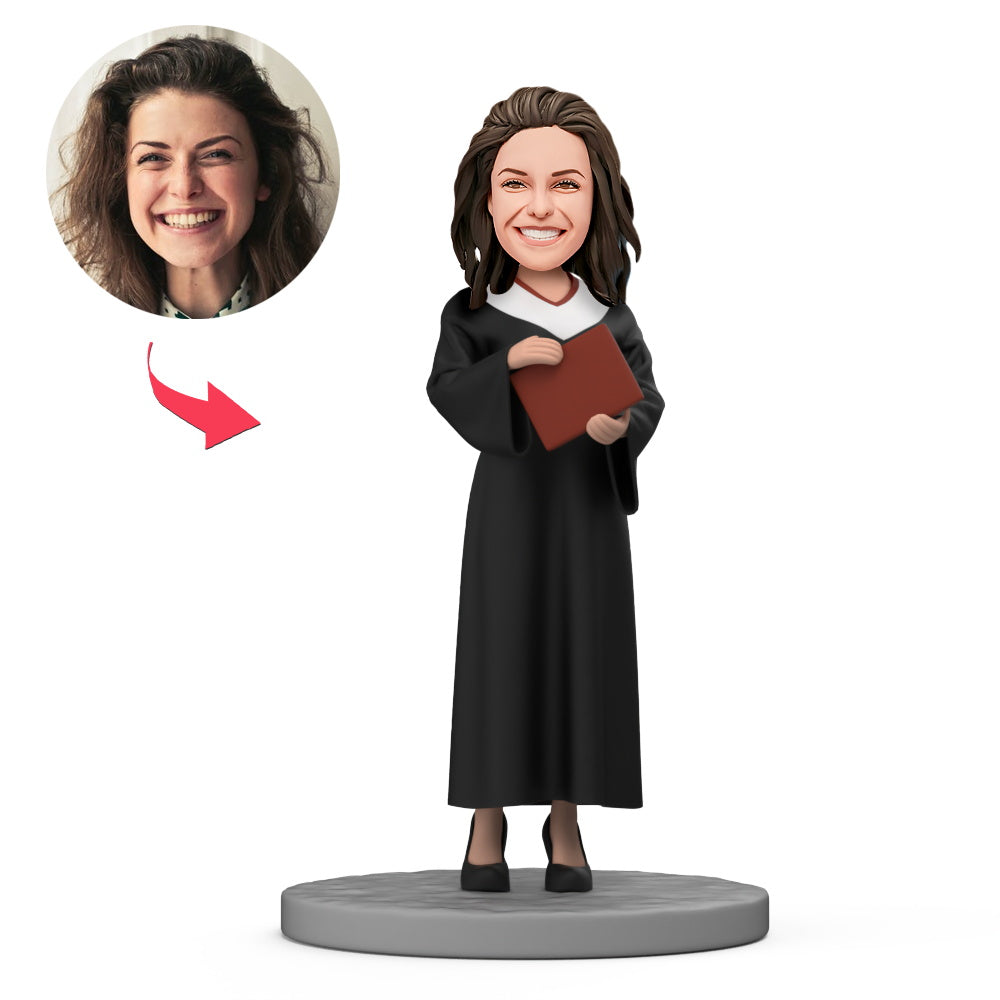 Female Lawyer Wear Judge Robe Hold Red Book Custom Bobblehead with Engraved Text