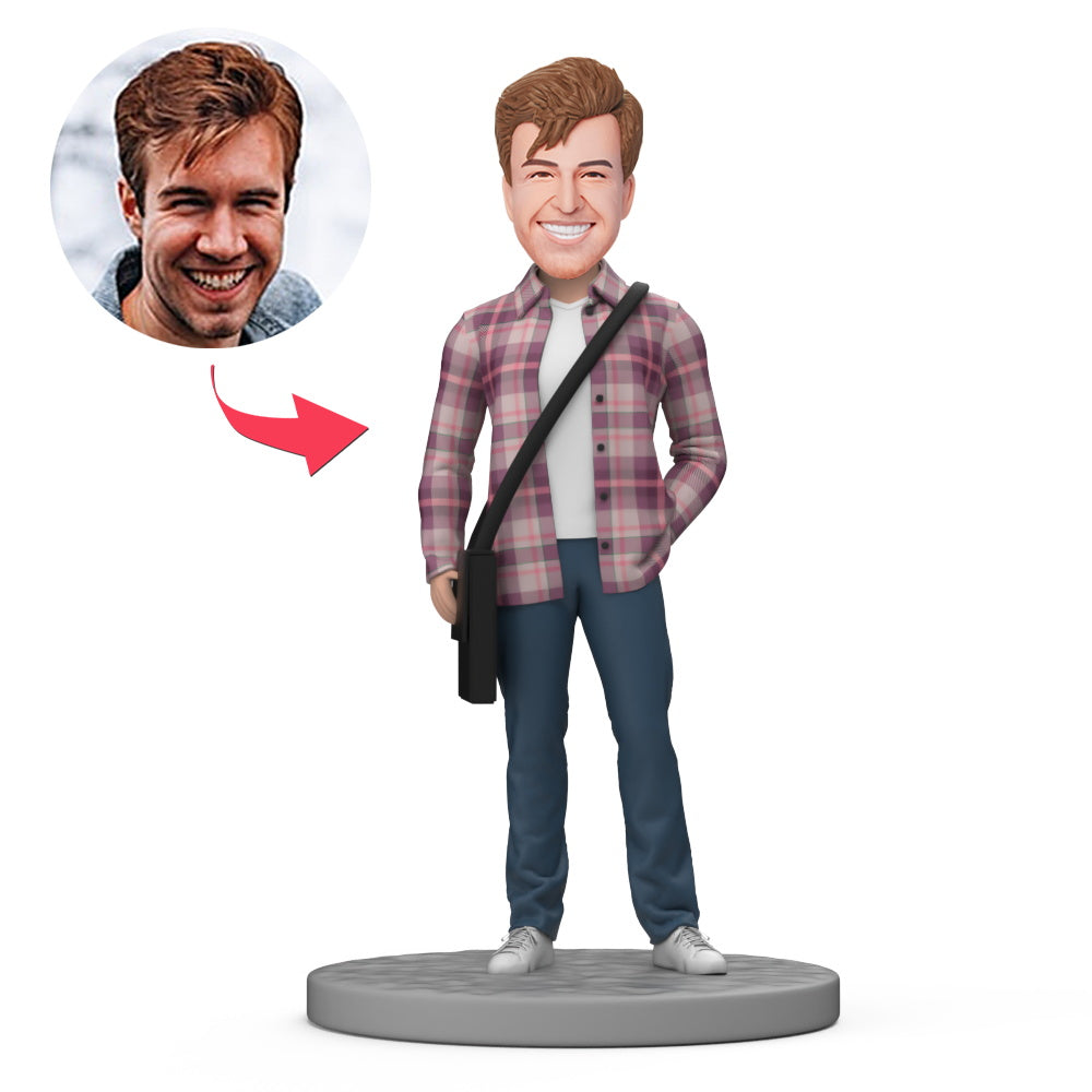 Male Student Carry Bag and Wear Purple Plaid Shirt Custom Bobblehead with Engraved Text