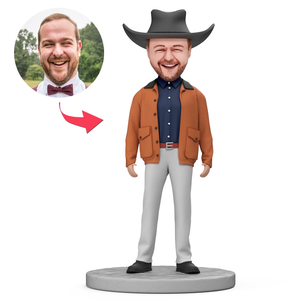 Custom Man in Orange-red Jacket and Cowboy Hat Custom Bobbleheads With Engraved Text Gift
