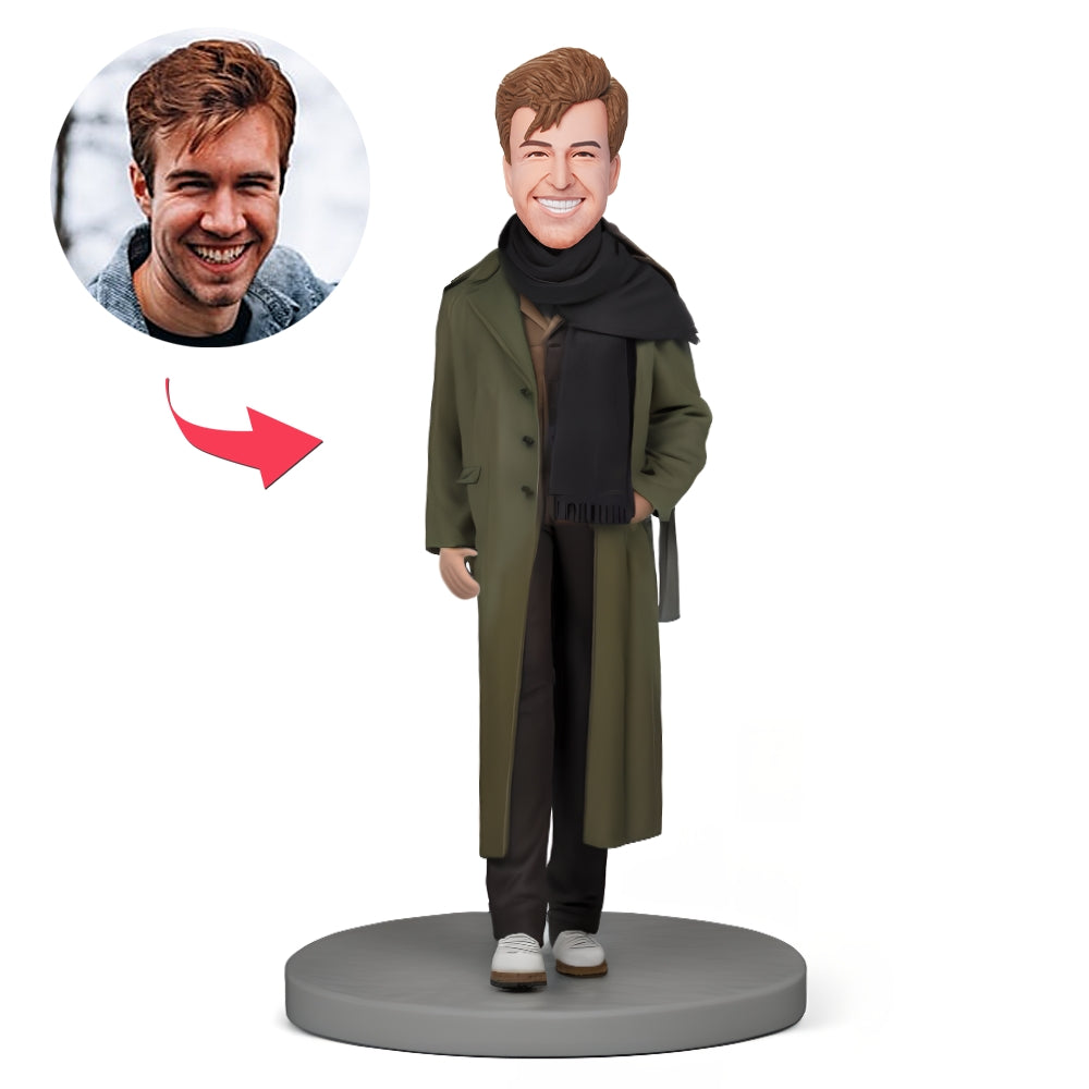 Custom Bobblehead Fashionable Man in Dark Green Coat With Black Scarf