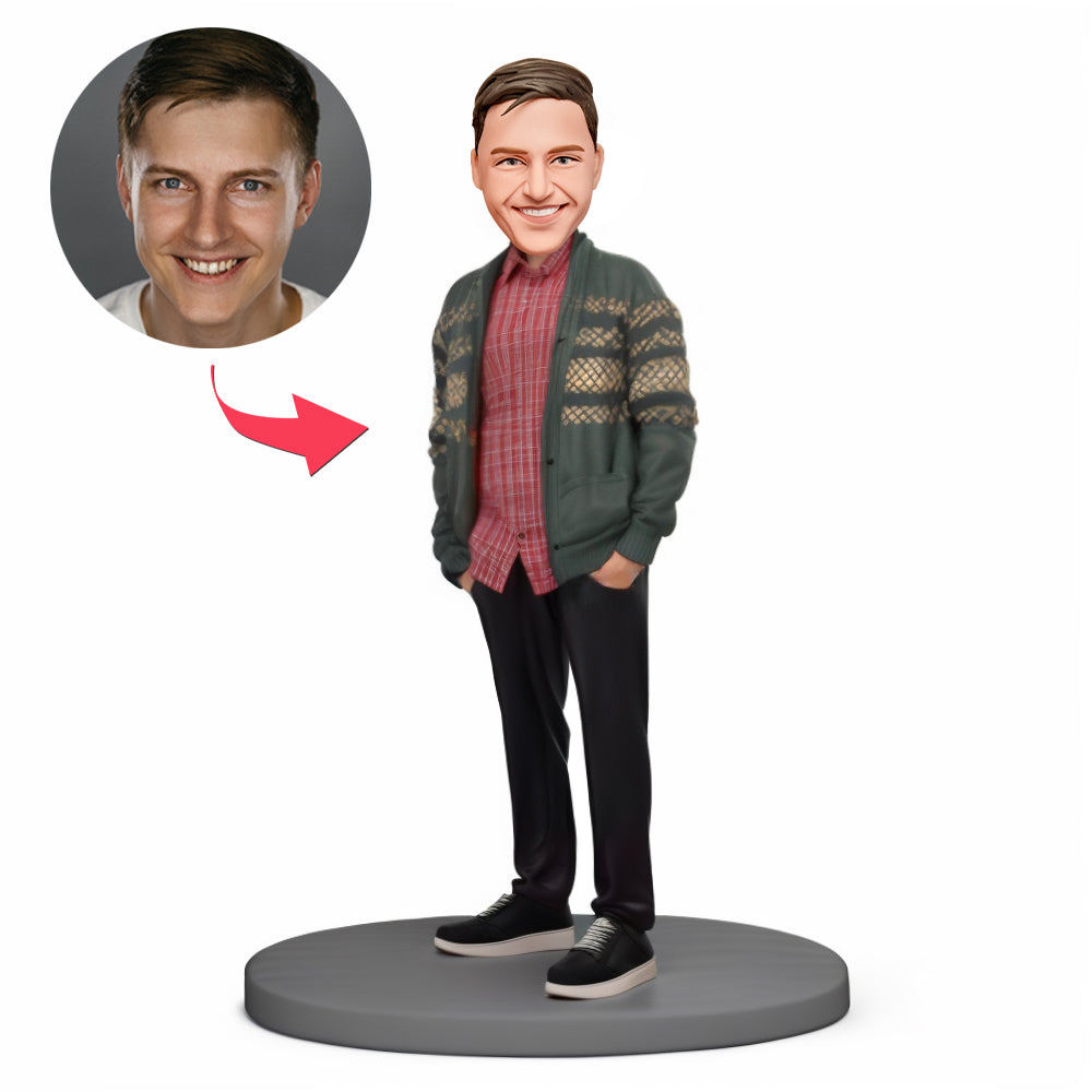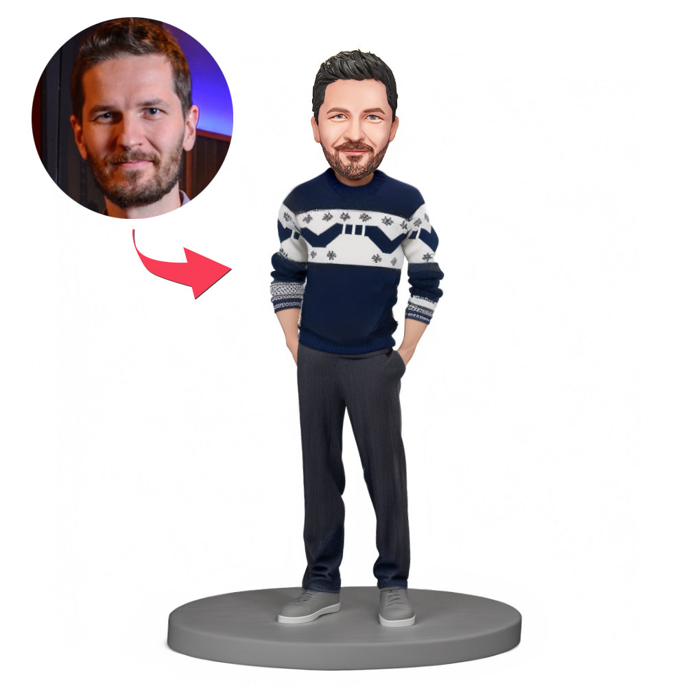 Christmas Gift Custom Bobble Head Handsome Man Wearing Blue Christmas Sweater