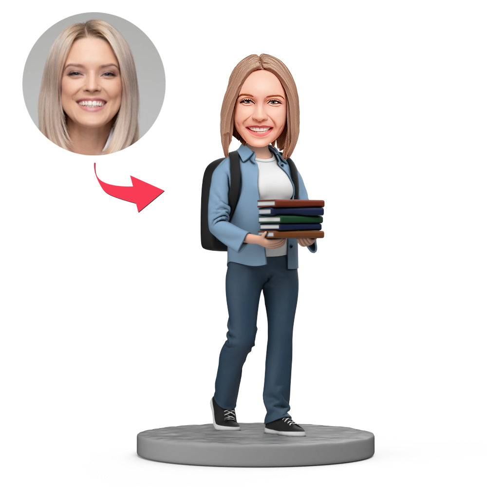 Female Student Carry Bag and Hold Books Custom Bobblehead with Engraved Text