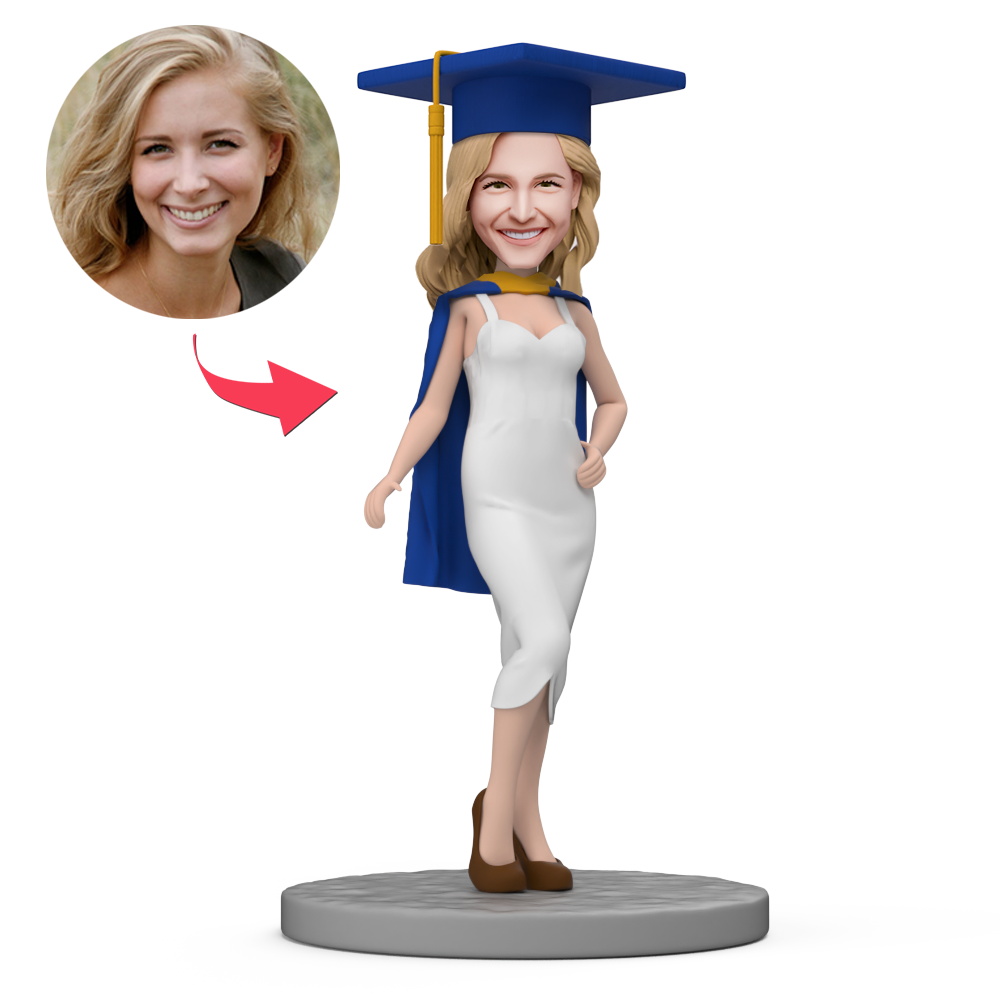 White Graduation Dress and Blue Graduation Cap Custom Bobblehead with Engraved Text