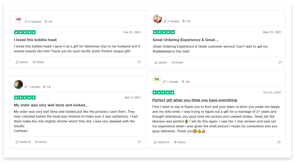 We have a strong customer service team and if you have any questions, please feel free to contact us at our Customer service email: cs@myfacebobbleheads.com.