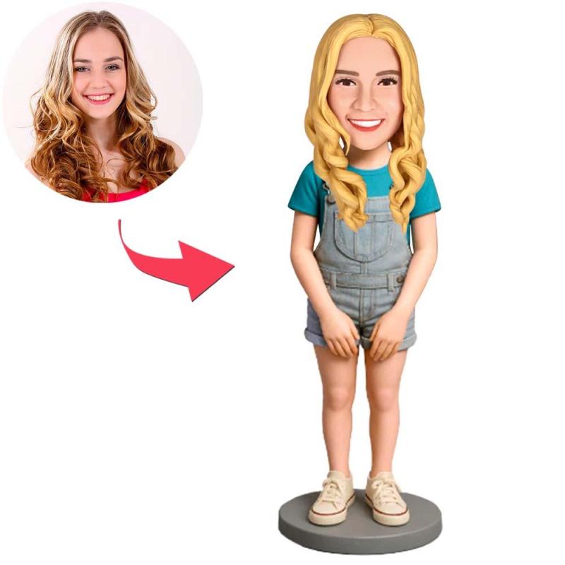 Female Student Wearing Denim Overalls Custom Bobblehead with Engraved Text