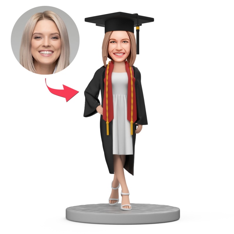 Graduating Student in White Dress and Graduation Gown Custom Bobblehead with Engraved Text