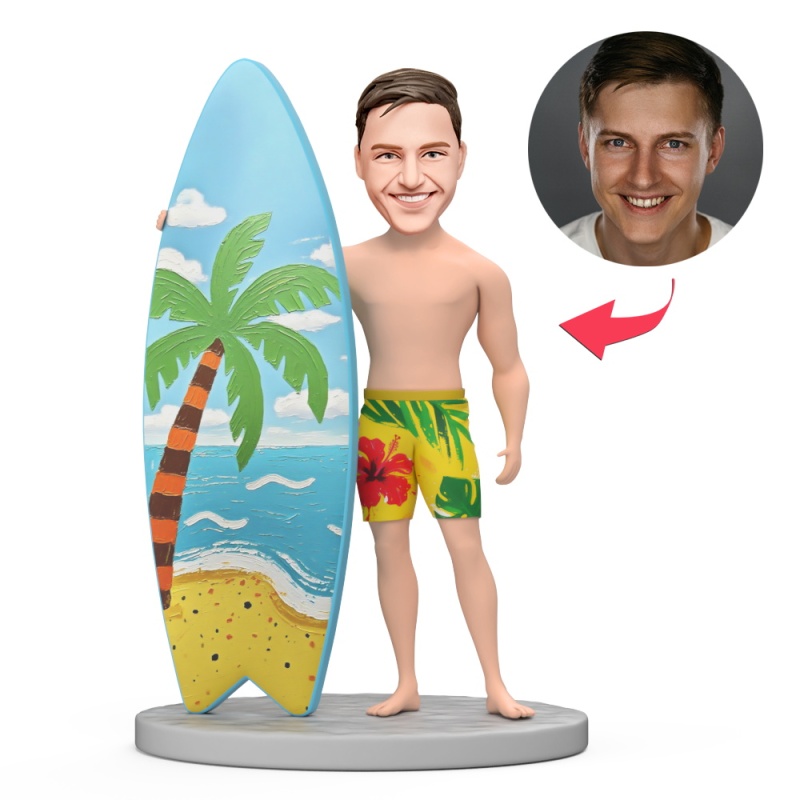 Hawaiian Man Surfing Custom Bobblehead with Engraved Text