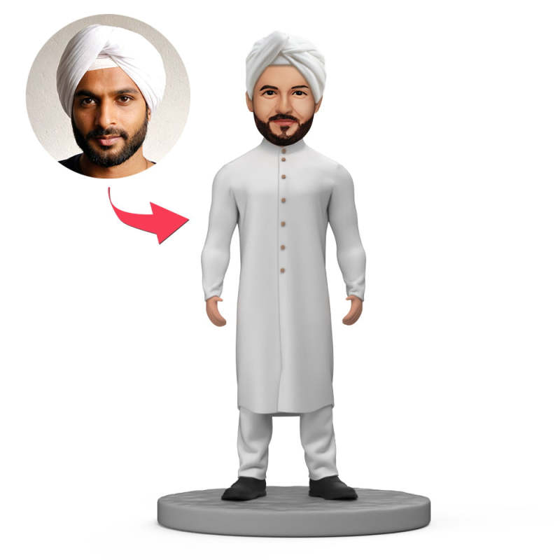 Male Indian Wear White Turban Custom Bobblehead with Engraved Text