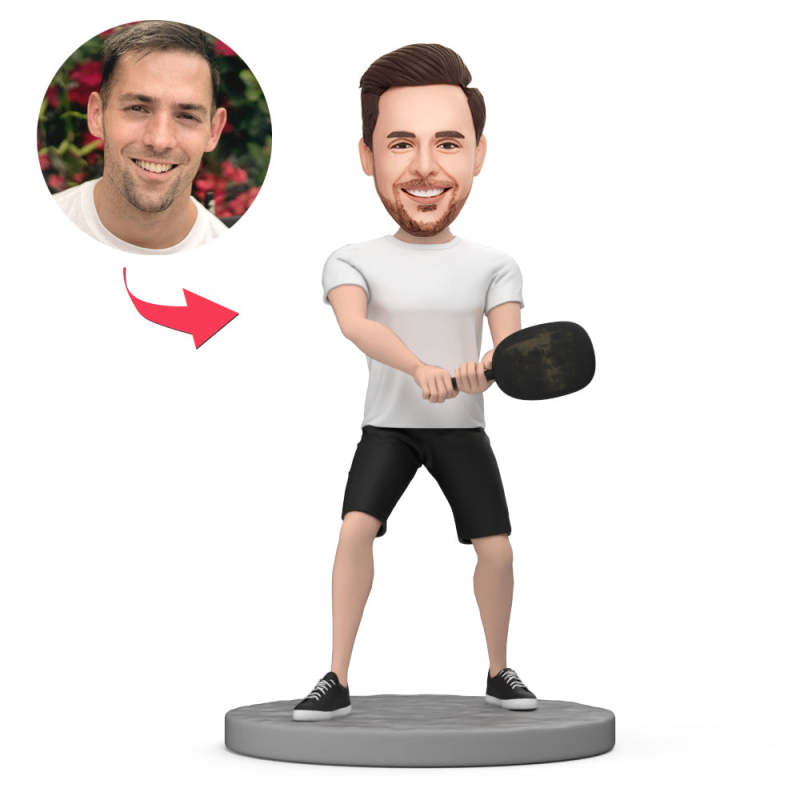Male Pickleball Player Wearing White T-shirt Custom Bobblehead with Engraved Text