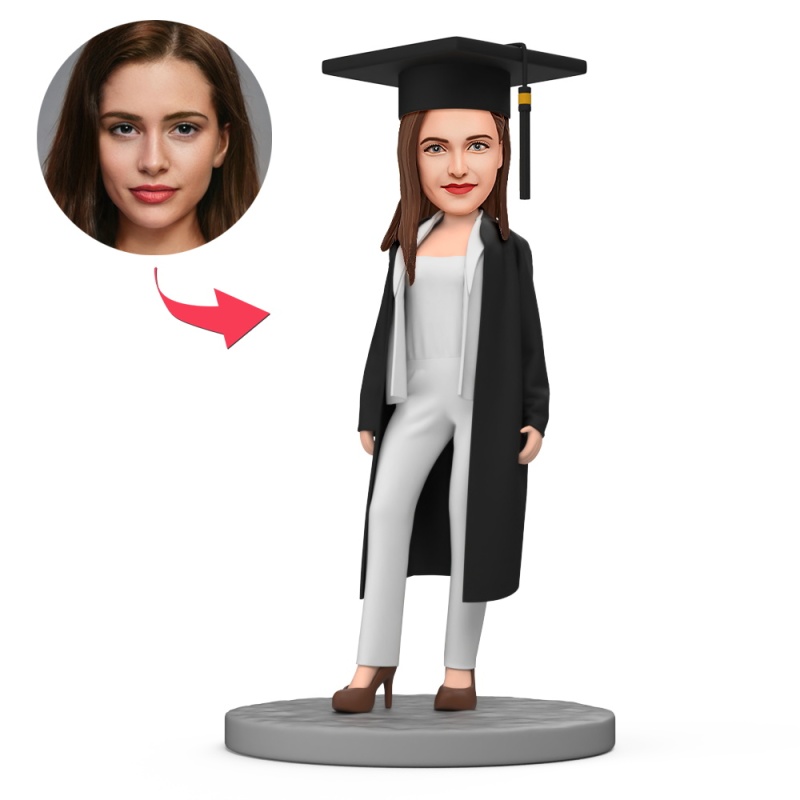 White Graduation Outfit and Gown Custom Bobblehead with Engraved Text